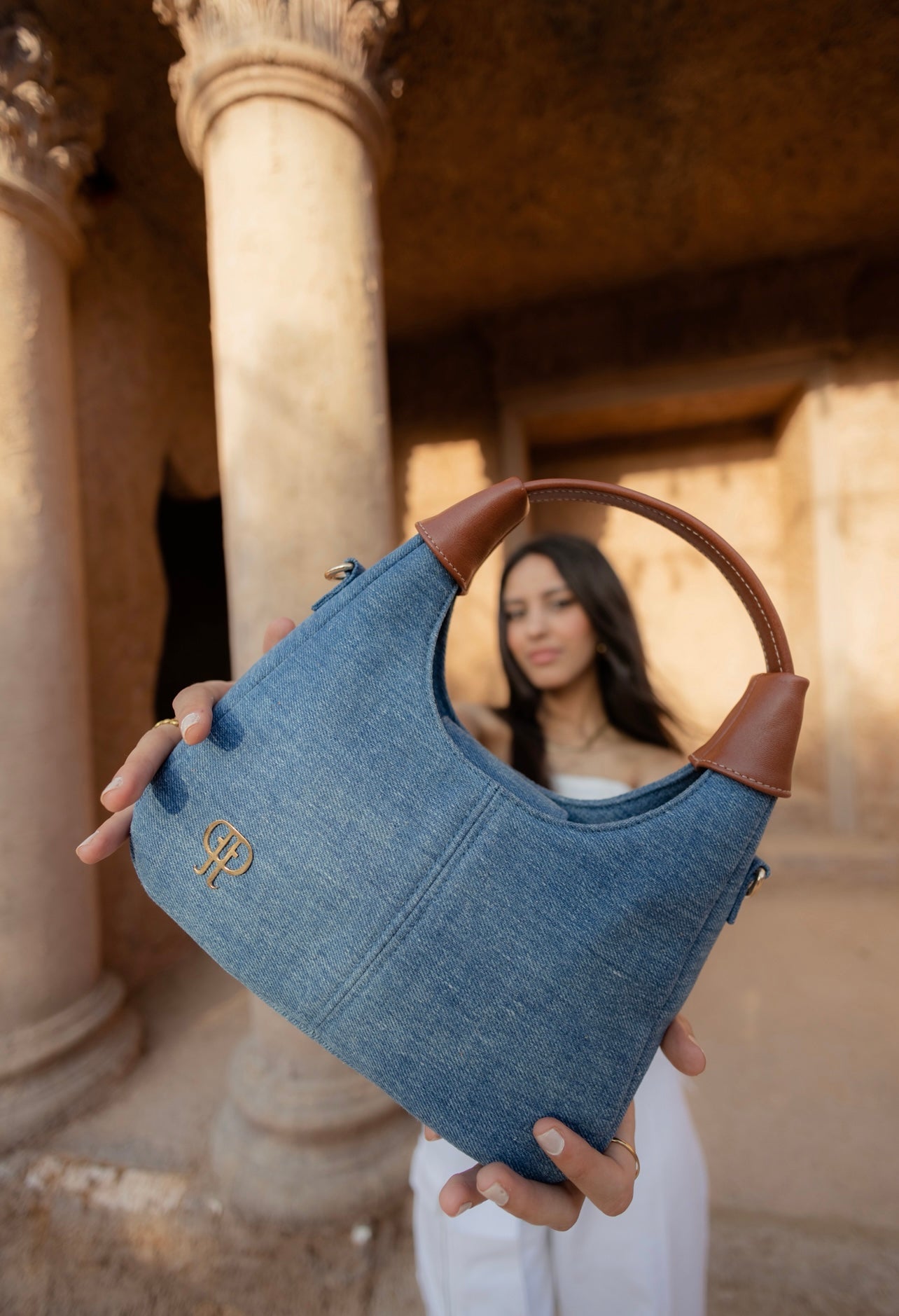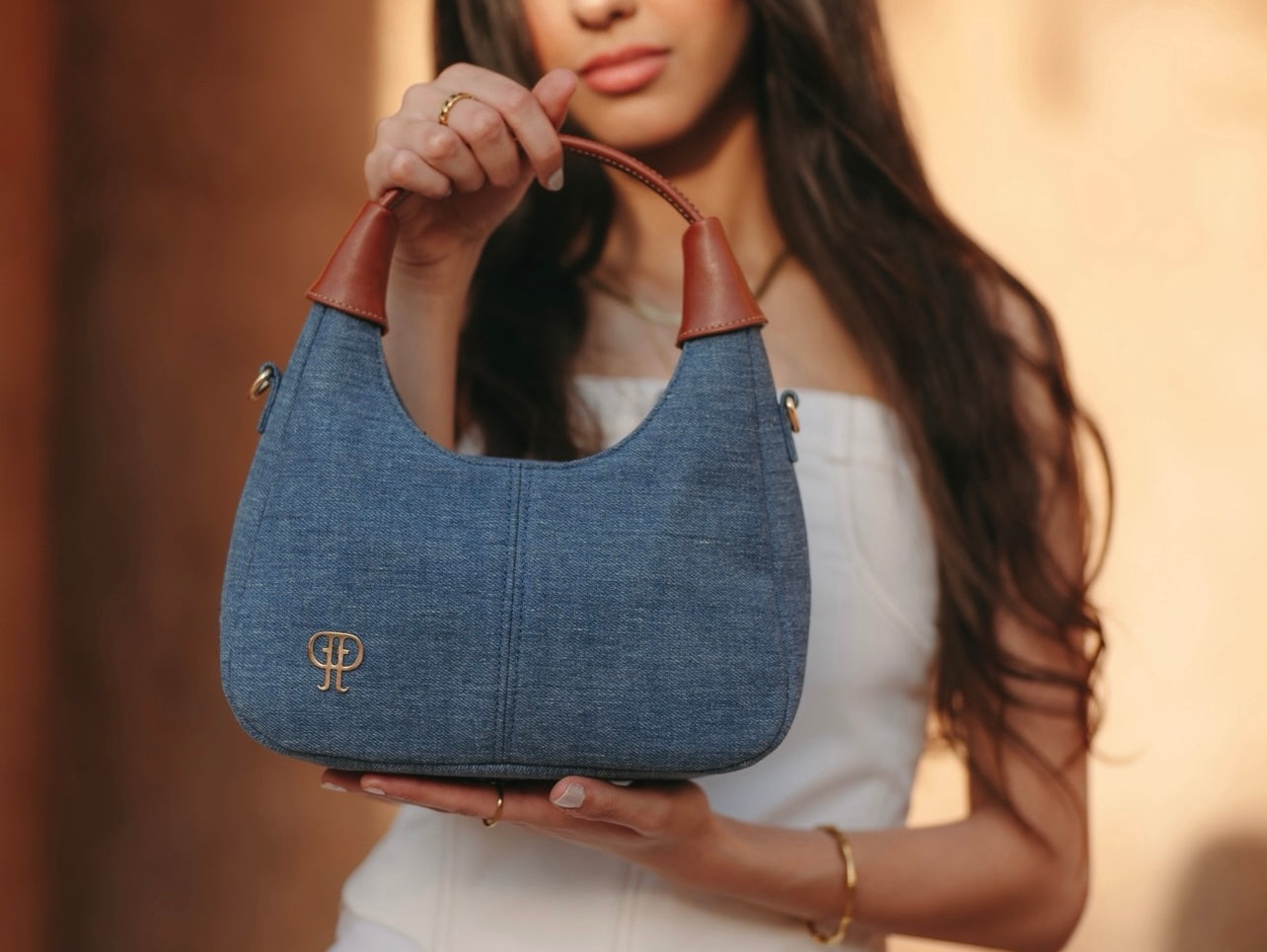 Made from high-quality denim and paired with a genuine nappa leather handle, the Denim Days Bag blends durability with elevated style. It features a detachable strap for versatile wear, whether handheld or as a shoulder bag. Lightweight yet practical, it's designed to complement almost any outfit effortlessly. The bag is finished with Dejour’s signature gold-plated logo for a refined final touch.